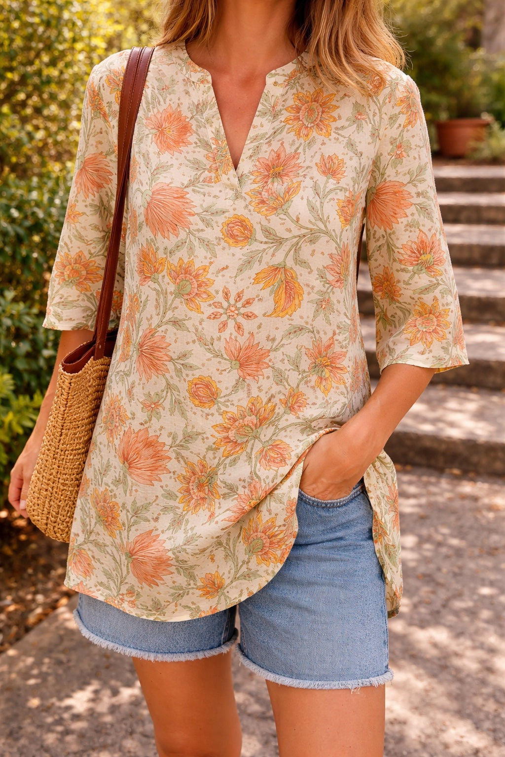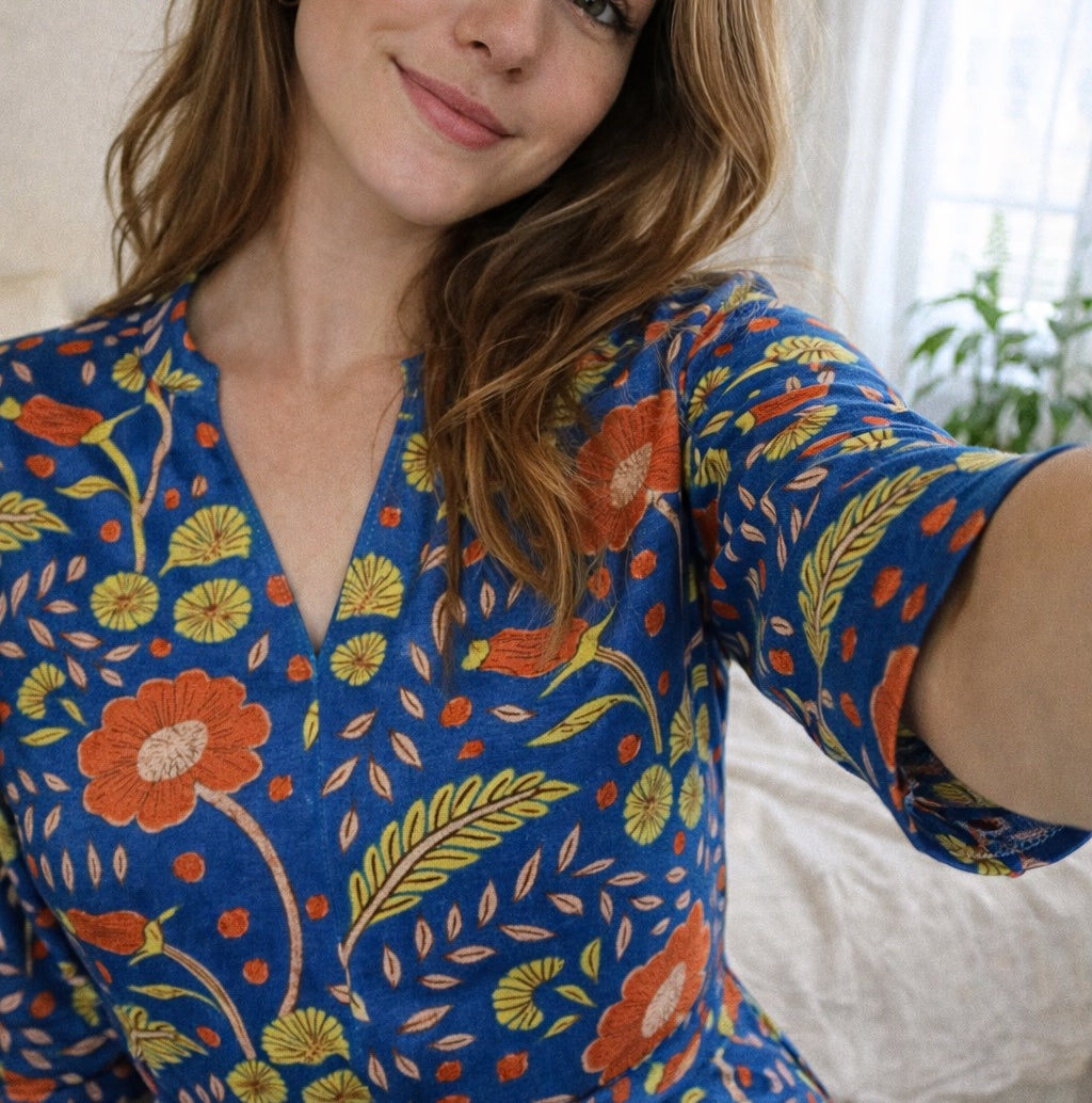 Confectionné en coton blockprint 100% artisanal, imprimé à la main à Jaipur. Le tissu est doux, respirant et agréable à porter, idéal pour la belle saison. Chaque pièce porte les légères nuances du travail manuel, ce qui en fait un vêtement vivant, unique et authentique.